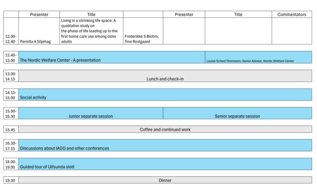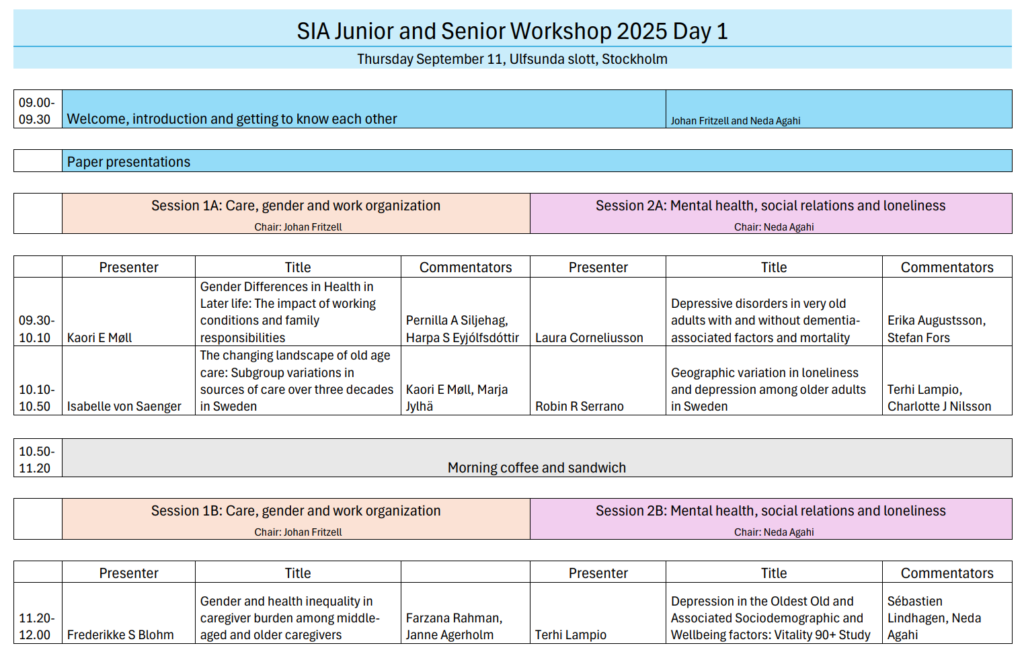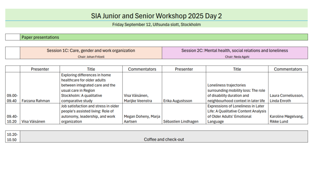 The 2025 SIA junior and senior workshop was held in Stockholm at Ulfsunda slott on September 11 to 12. Researchers from Denmark, Sweden, Norway, Finland and Iceland participated. During the workshop, current Nordic research on aging and health was discussed based on 13 ongoing doctoral projects (see the workshop program below for a list of manuscript titles). With the support of the network’s senior researchers, the more junior members were able to practice highlighting issues of social inequality in their own studies and those of their colleagues.